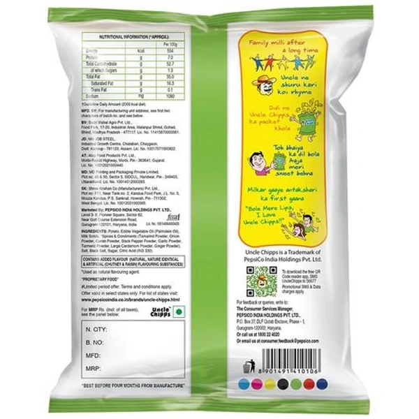 ABOUT THE PRODUCT:Treat yourself to some delicious, crunchy, perfectly salted chips! Uncle Chipps is undeniably everyone’s favourite! For years, they have been around and have been a constant source of fun and pleasant memories. Made from the best quality potatoes and simply seasoned with salt, Uncle Chipps are a flavorful delight! Enjoy watching your favourite programs with a bag of Uncle Chipps or have this delicious treat on your quick work break. These chips are just perfect to snack on and their irresistible flavour makes them the ideal go-to treat.